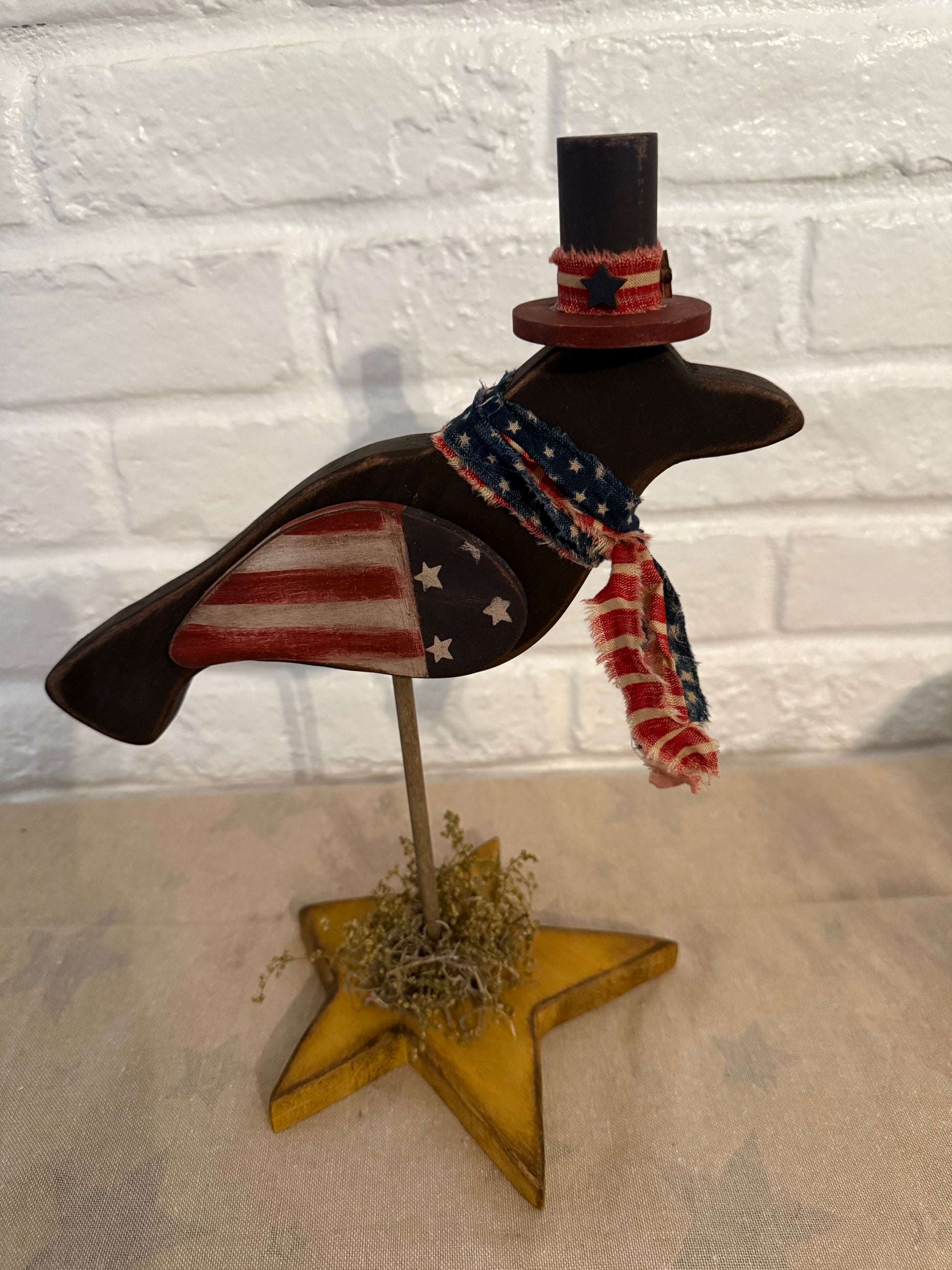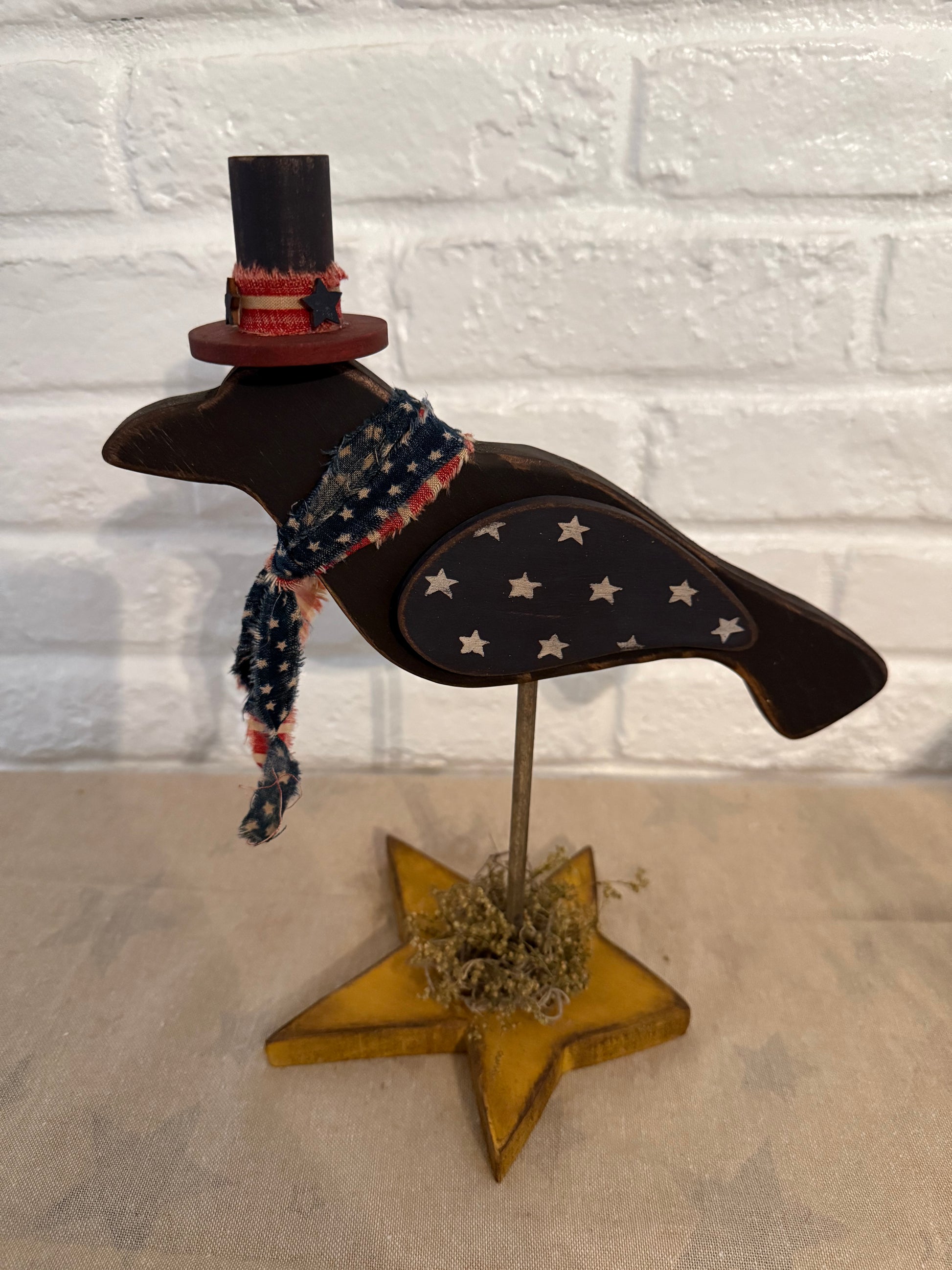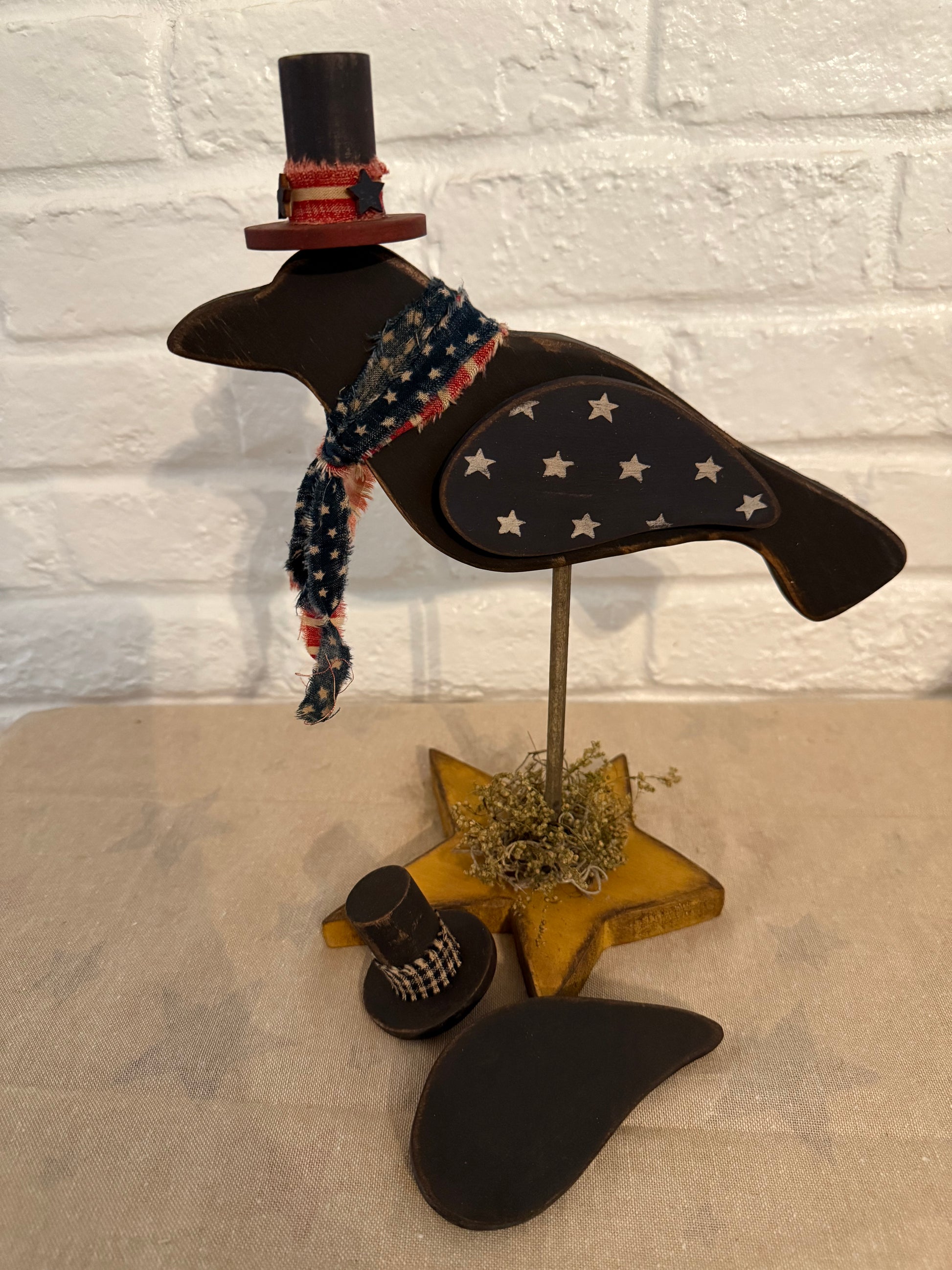 Hand-cut from solid wood, this adorable little bird measures about 8” from beak to tail feathers. He perches proudly on a 4” wooden star—because even crows deserve to shine.